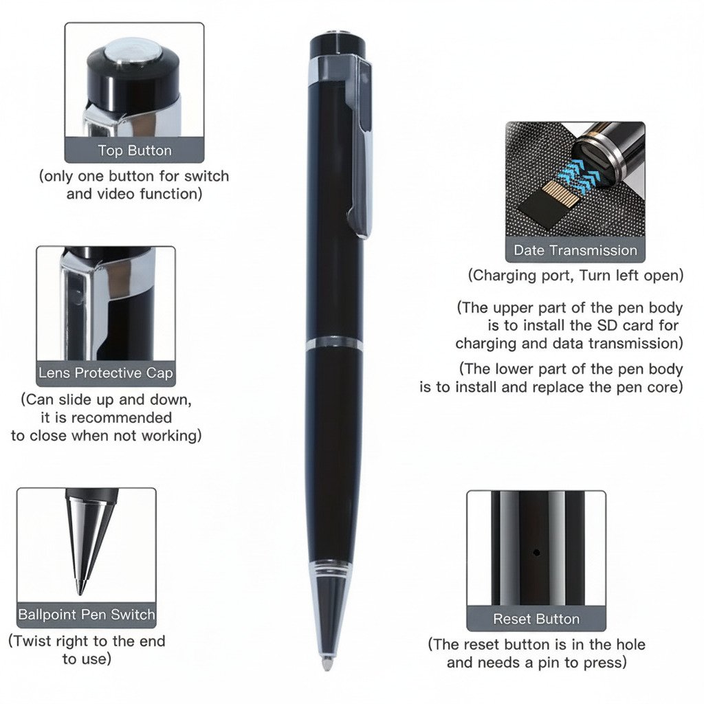 تصميمه الفاخر يجعله يبدو كقلم عادي تمامًا، لكن بداخله كاميرا دقيقة وعدسة عالية الوضوح تلتقط كل التفاصيل بوضوح تام 👁️